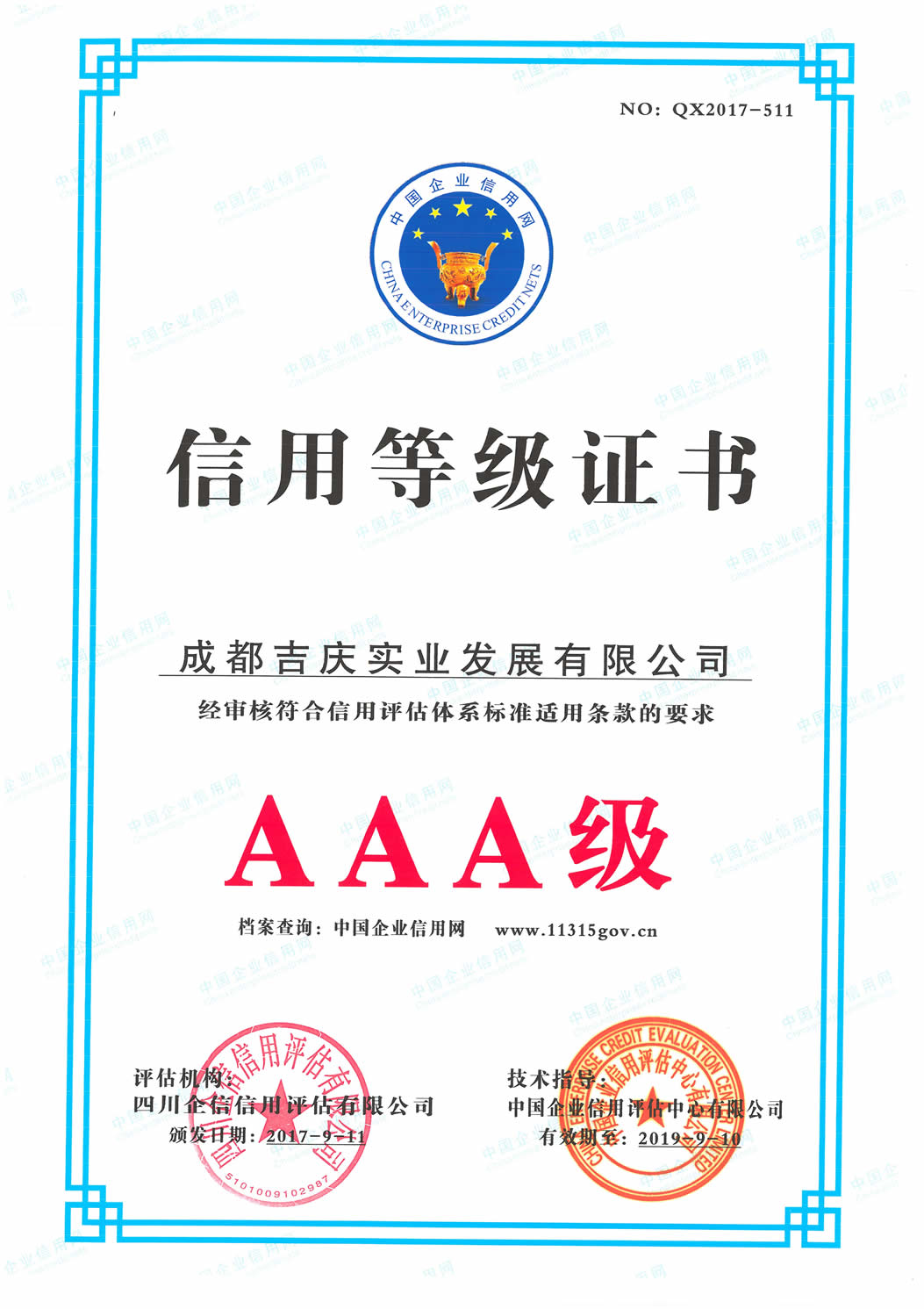 AAA信用等級證書